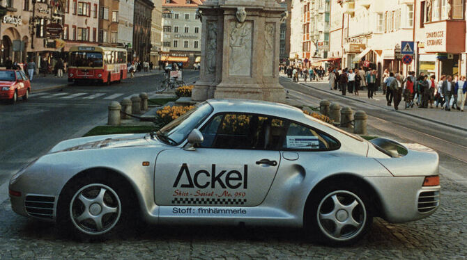 Andreas Ackel zeigt im Mode-Outlet das Plakat, auf dem die Partnerschaft mit der Fluglinie Pan Am bekannt gemacht wurde: Von der Wand dahinter grüßt der Vater und 2020 gestorbene Gründer der Firma, Viktor Ackel.