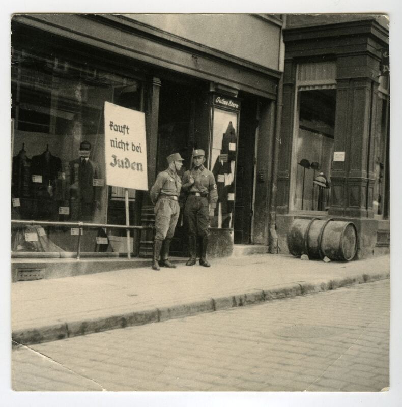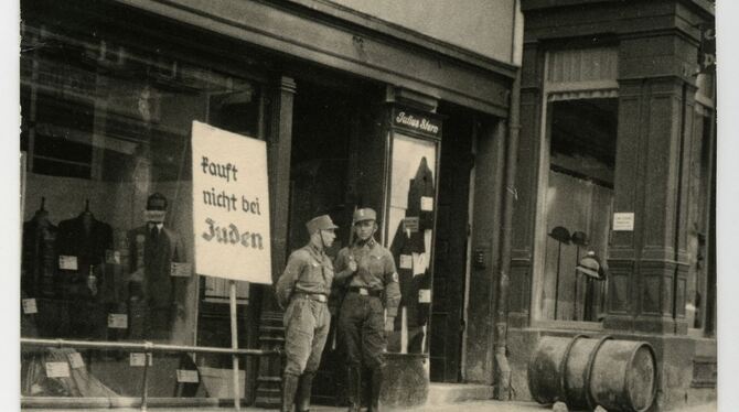 »Kauft nicht bei Juden« – Geschäftsboykott durch die Nationalsozialisten am 1. April 1933 mit SA-Männern vor dem Herrenbekleidungsgeschäft von Gustav Lion, ehemals Julius Stern, in der Neckargasse 4. FOTO: GRÖGER, STADTARCHIV TÜBINGEN