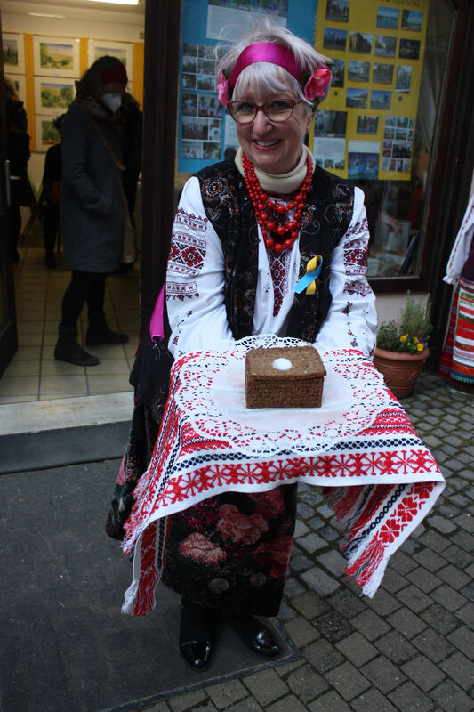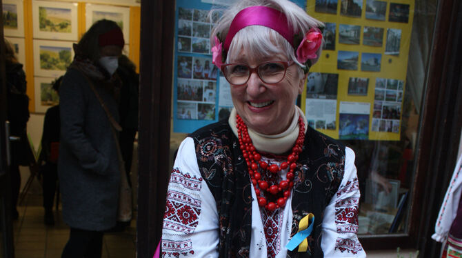 Anna Arlamova ist eine feste Größe in der Tübinger Künstler-Szene, hier bei der Aktion am Samstag, bei der Tübinger Künstler Werke für ukrainische Freunde verkauften. FOTO: STURM
