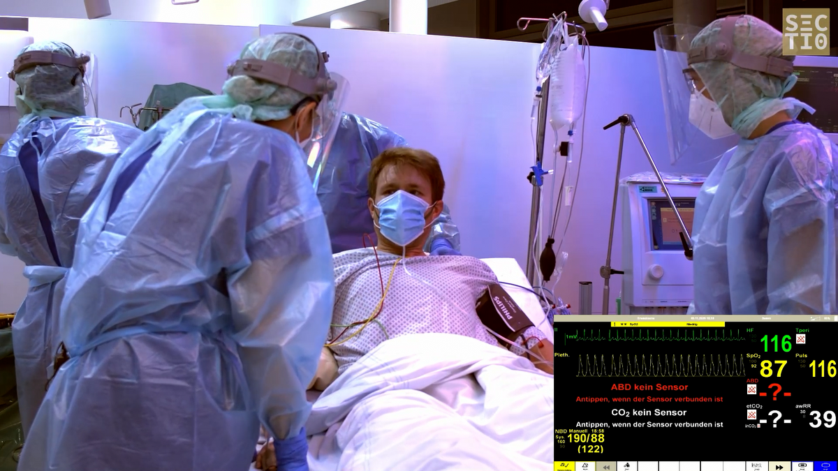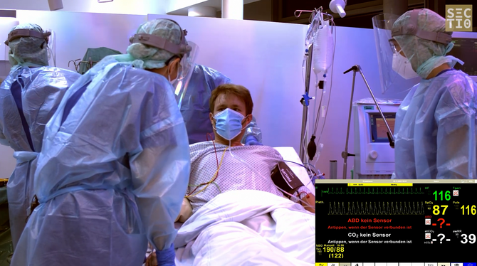 Szene aus dem Lehrfilm zur intensivmedizinischen Therapie bei Covid-19-Patientinnen und -Patienten. SCREENSHOT: INSTITUT FÜR KLINISCHE ANATOMIE UND ZELLANALYTIK, UNIVERSITÄT TÜBINGEN.