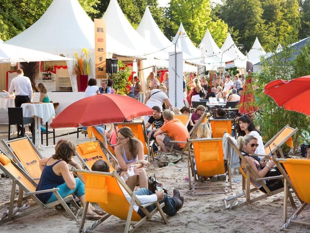 Alternative zu Sitzbänken: Nach dem Essen kann auf Liegen bei der Tübinger Sommerinsel am Anlagensee gechillt werden.