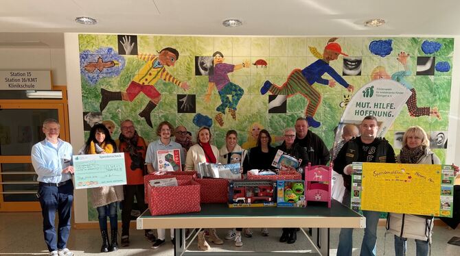 Mitarbeiter, Spender und Organisatorin haben in der Kinderklinik Tübingen die Geschenke aufgebaut und die Kinderherzen höher schlagen lassen. FOTO: RUNGE