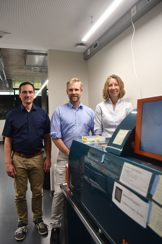 Diese blaue Maschine produziert die hochdimensionalen Bilder. Dahinter (von links): Manfred Claassen, Kilian Wistuba-Hamprecht und Saskia Biskup. FOTO: SCHERTLIN