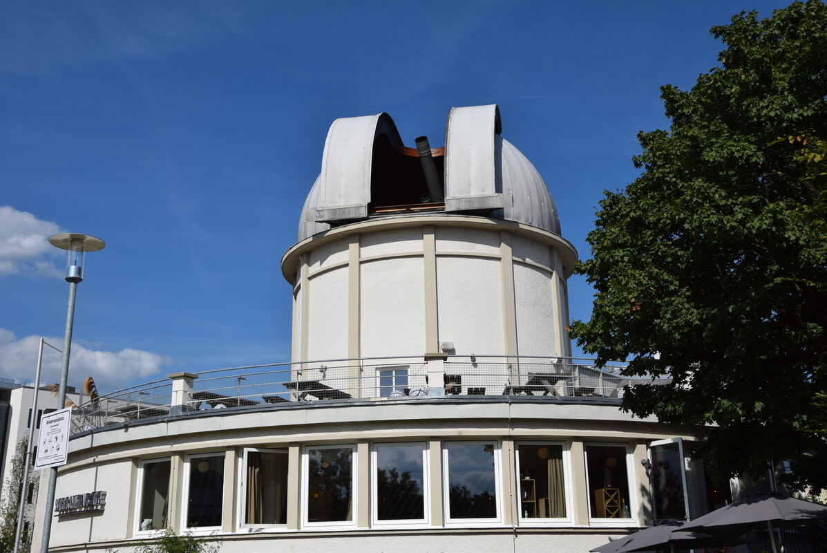 Das Bild hat sich deutlich geändert. Ein gastronomischer Betrieb ist um den kleinen weißen Bau eingezogen. Der Blick Richtung Technologiepark ähnelt einer Hochglanzbroschüre für moderne Architektur. Der Weg nach oben zum Kuppelsaal gleicht dagegen einer Zeitreise. Hoch wölbt sich die rotbraune Kuppel aus Lärchenholz über das beeindruckende Gerät. Die Kuppel hat einen Durchmesser von acht Metern und kann mit einem großen Drehrad von Hand geöffnet werden, will man in die Sterne oder in die Sonne schauen. Eine Hebebühne garantiert den besten Blick des Betrachters durch das Okular.