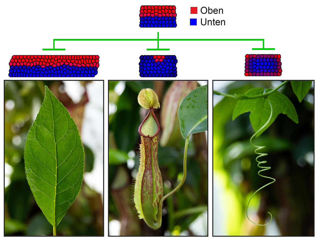 Dazu arbeitete ein Team aus der Mathematik und praktischen Biologie zusammen, um mit Hilfe von Computermodellen, Methoden der molekularen Genetik und bildgebenden Verfahren am lebenden Organismus die Prozesse zu verfolgen. »Grundlage einer solchen Musterbildung ist eine Polarität, also die Möglichkeit in diesem Fall, zwischen oben und unten zu unterscheiden. Sie entsteht in der Regel durch einen Konzentrationsgradienten eines Stoffs, Morphogen genannt, der an der einen Seite gering, an der anderen höher ist«, erklärt Scacchi. Das Team entdeckte, dass im wachsenden Blatt sogenannte kleine RNAs eine entscheidende Rolle bei der Steuerung spielen. Als mobile Boten sind sie bei der Kommunikation der Zellen untereinander im Einsatz und helfen ihnen, ihre relative Position zueinander im Gefüge wahrzunehmen. Außerdem übermitteln die RNAs Informationen, über die koordiniert wird, welche Gene jeweils an der Ober- und Unterseite aktiviert oder gehemmt werden müssen, damit das Blatt die richtige Form erhält.