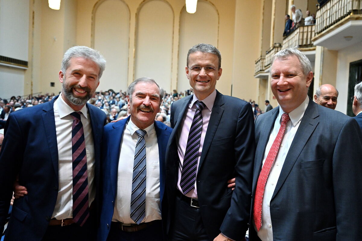 Viele waren zum Feiern in die Neue Aula der Uni gekommen (von links): OB Boris Palmer, Michael Bamberg, sein Nachfolger Jens Maschmann und Bernd Pichler, Dekan der Medizinischen Fakultät.