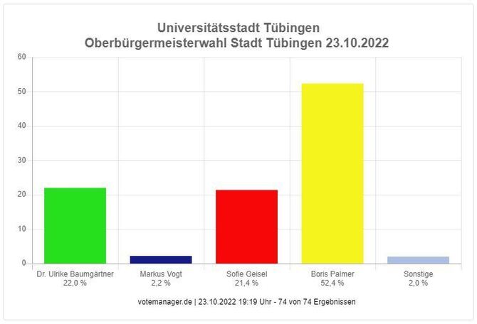 Am Ende zeigte sich Palmer versöhnlich mit seinen Parteigenossen: Zusammen habe man knapp 75 Prozent der Stimmen erhalten, sagte er. Der Amtsinhaber siegte in jedem Wahlbezirk. Am stärksten schnitt er in Bebenhausen ab. Dort sammelte er 64,9 Prozent der Stimmen. Die wenigsten erhielt er im Bezirk Innenstadt Nord-Ost (42,5 Prozent).
