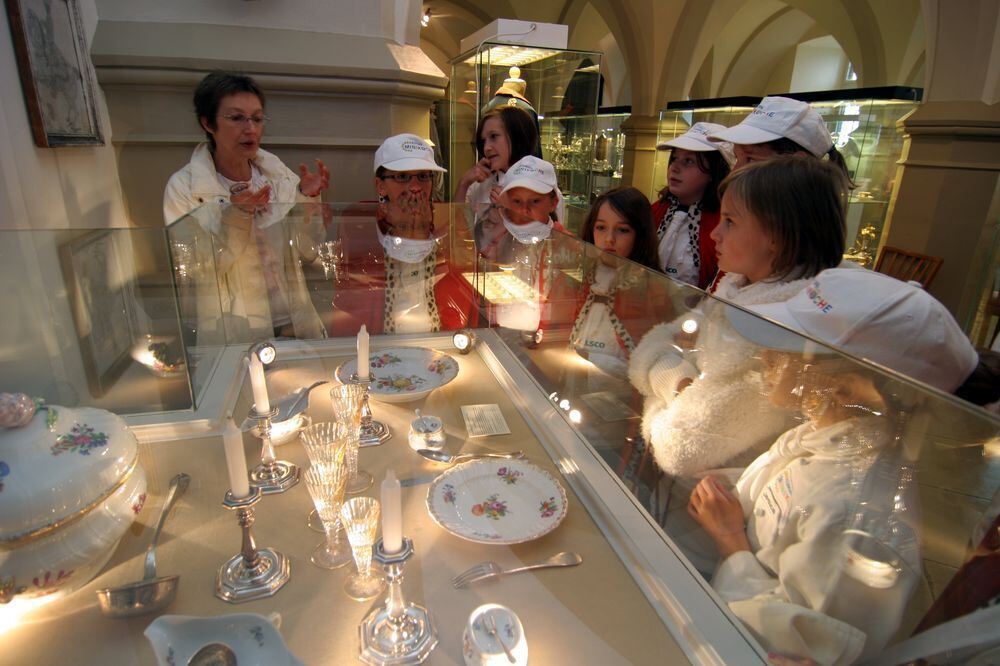 Hohenzollern-Preußens Glanz und Gloria in Porzellan: Sandra Stopper zeigt Miniköchen das Service des Königs Friedrich II., genannt der Große, im Hintergrund sein blauer Soldatenrock.