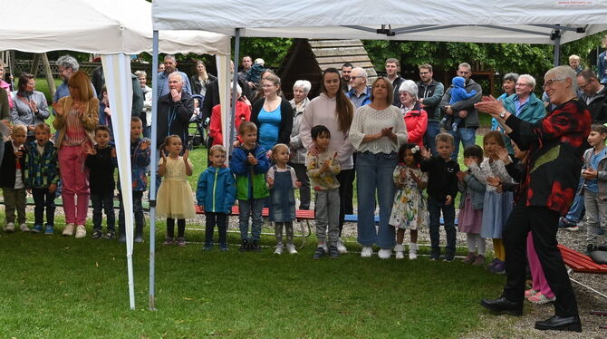 Denn Kocher und ihre Mitarbeiterinnen verbringen viel Zeit mit Bewegung und Naturerlebnissen bei jedem Wetter. Sie fördern und fordern die gesunde Entwicklung. »Mit allen Sinnen die Welt erkunden«, lautet das Motto. Dazu gehören auch das Singen und Musizieren, wofür der Kindergarten drei Mal mit dem Felix-Preis ausgezeichnet wurde – dem Gütesiegel des Deutschen Chorverbandes. Das fiel auch dem OB auf, als er zufällig unterwegs von einer Gruppe mit einem Ständchen begrüßt wurde. »Das ist insofern nicht außergewöhnlich, weil die Kinder auch für Kühe und Schafe singen«, so Bulander, der zeigte, dass es nicht nur tolle Tanten, sondern auch gute Onkels gibt – und alle Kinder zu einer Busfahrt ins Eiscafé einlud. (GEA)