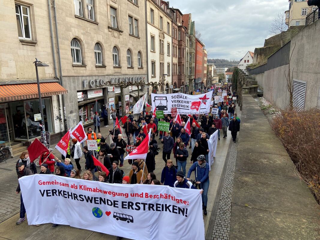 TÜBINGEN. Das Bündnis »Tübingen fährt voraus« hat am Freitag in der Universitätsstadt zum Klimastreik aufgerufen. Von den 1.000 angemeldeten Teilnehmern folgten rund 800 Demonstrierende dem Aufruf der Organisatoren. Die Polizei sprach von 500 Teilnehmern. Es war der erste Streik, den Verdi zusammen mit den lokalen Klimaschutz-Gruppen organisierte. Fridays For Future, der Jugendgemeinderat der Stadt Tübingen sowie die Gruppierungen Antikapitalistisches Klimatreffen, Attac, Zak3 und Ende Gelände forderten zusammen mit der Gewerkschaft Verdi eine klimagerechte Verkehrswende, kostenlosen Nahverkehr und bessere Arbeitsbedingungen für Busfahrer. Die Demonstration ordnete sich den bundesweiten Tarifstreiks im Nahverkehr zu.