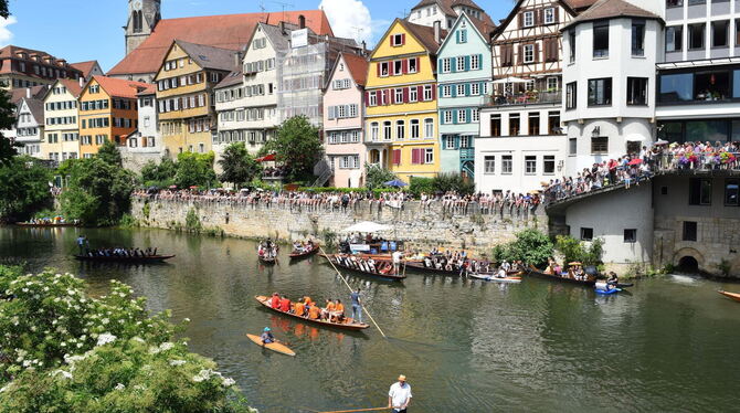 TÜBINGEN. Tausende Besucher haben in Tübingen das traditionelle Stocherkahnrennen beobachtet. Pünktlich um 14.00 Uhr starteten 56 Mannschaften in hölzernen Booten zum Rundkurs um die Neckarinsel. Bei sommerlich heißem Wetter kamen sie schon auf den ersten Metern ins Schwitzen, bevor sie die eigentliche Herausforderung der Rennstrecke erreicht hatten: die als »Nadelöhr« bezeichnete Engstelle unter der Neckarbrücke. Jede Mannschaft muss sich vor dem Endspurt flussaufwärts gleich zwei Mal hindurchmanövrieren - vor und nach der Umrundung des Brückenpfeilers Mitten im Neckar.