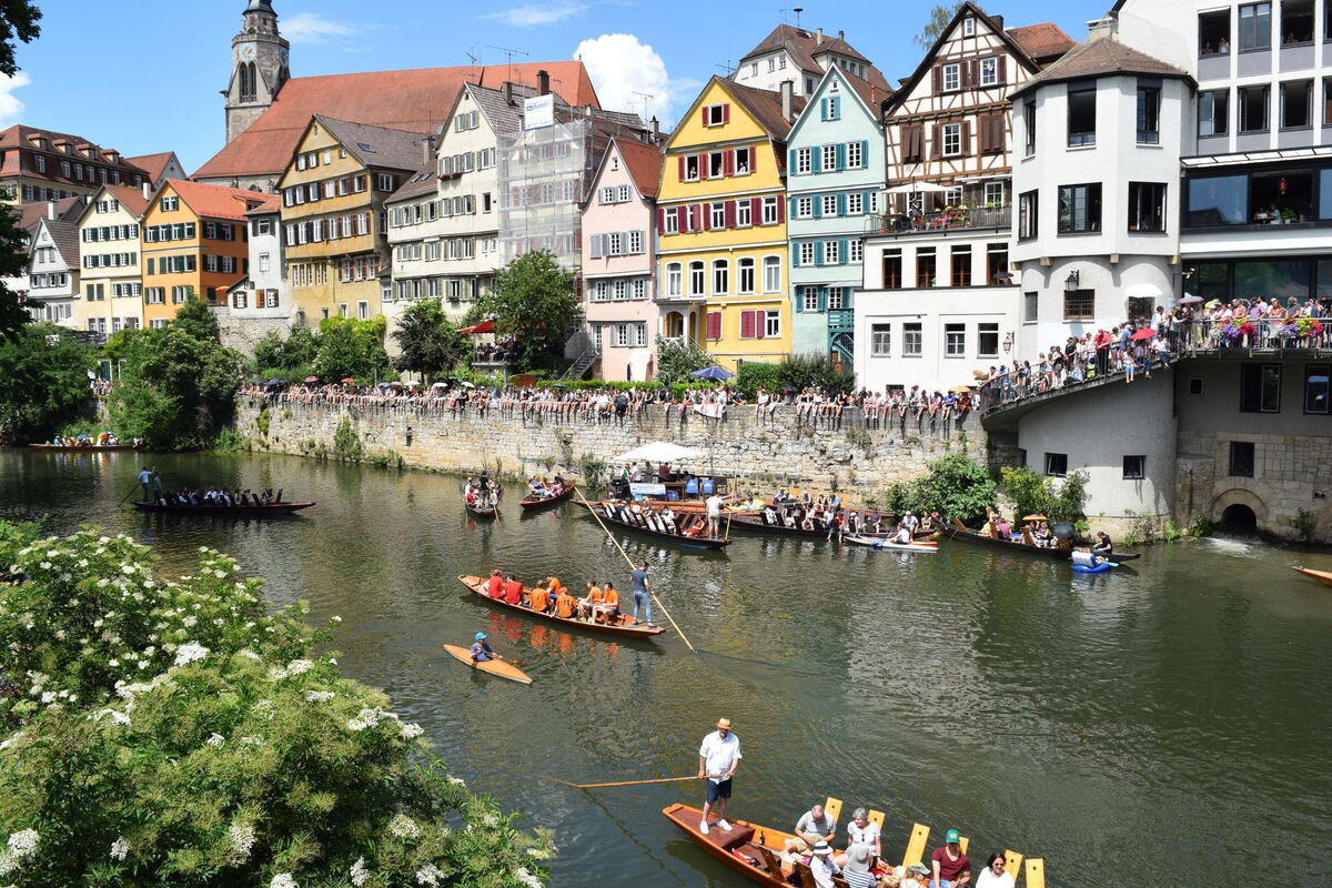 Stocherkähne werden in der Regel mit einer langen Holzstange vom Flussbett abgestoßen und so angetrieben. Die Mannschaften haben aber auch mit den Händen gepaddelt, um auf eine gute Geschwindigkeit zu kommen. Vor Beginn des Rennens präsentierten sich die Teilnehmer bei einer Kostümparade auf dem Neckar - unter anderem im Abba-Outfit und als Piraten verkleidet.