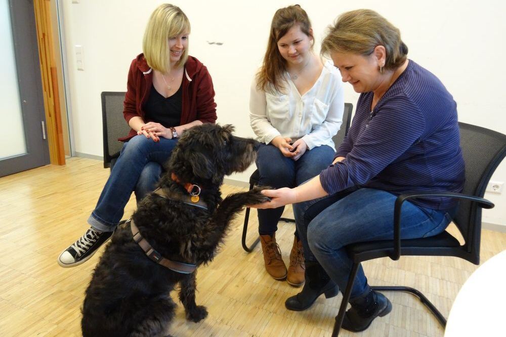 Gib Pfötchen! Therapiegruppe mit Hund: (von links) Krankenschwester Stefanie Köhler, Jana Rilling (Bufdi) und Ewa Ciepluch (Praktikantin) mit der Hündin Layla. FOTO: UKT