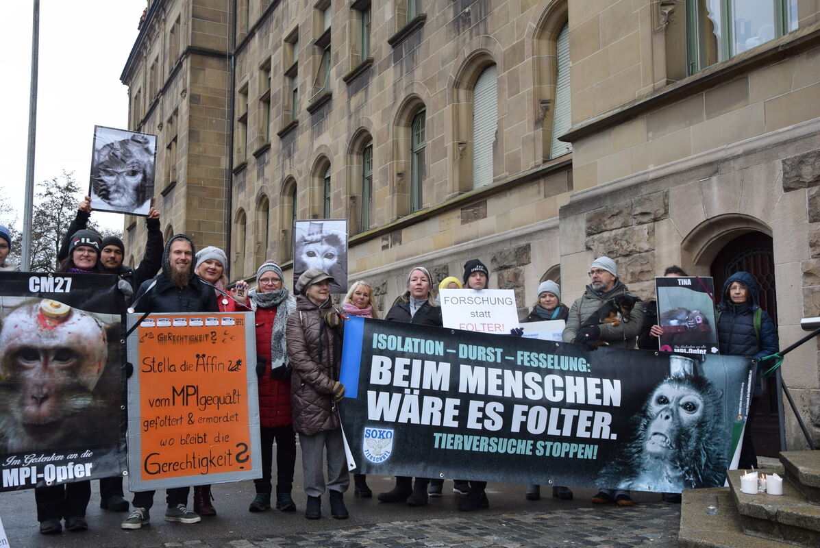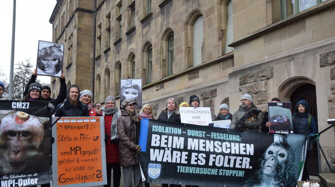 TÜBINGEN. Eine Gruppe von 20 bis 30 Menschen hat sich heute Morgen mit Transparenten vor dem Eingang des Gerichtsgebäudes aufgestellt. Bleiben wollen sie dort bis 15 Uhr. Hintergrund des Protestes ist der abgesagte Prozess gegen Nikos Logothetis und zwei weiteren Mitarbeitern des MPIs. Vorgeworfen wurde ihnen, drei Affen unnötig langes Leid zugefügt zu haben.