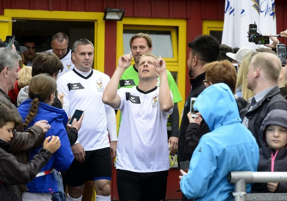 Comedian Oliver Pocher zelebrierte seinen Auftritt beim Promi-Kick, dahinter Silvio Meißner und Timo Hildebrand.