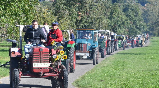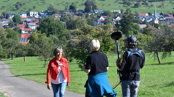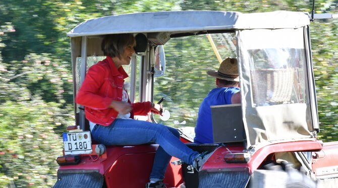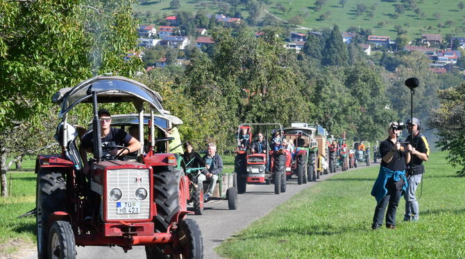 KUSTERDINGEN/GÖNNINGEN. »Mit dem Traktor auf der Alb« heißt eine neue Folge der SWR-Fernsehserie »Expedition in die Heimat«. Was nicht ganz korrekt ist, denn die dreißig Oldtimer von den Härten und weiteren Dörfern im Tübinger Kreisgebiet mussten zunächst einmal »auf die Alb« gelangen. Die Aufsehen erregende Ausfahrt am Samstagvormittag von Wankheim zur Roßbergsteige bei Gönningen wurde von mehreren Drehteams des Fernsehens verfolgt, auch mit einer Kamera-Drohne wurde die An- und Auffahrt auf den Gönninger Hausberg gedreht. Mittendrin die SWR Moderatorin Annette Krause.