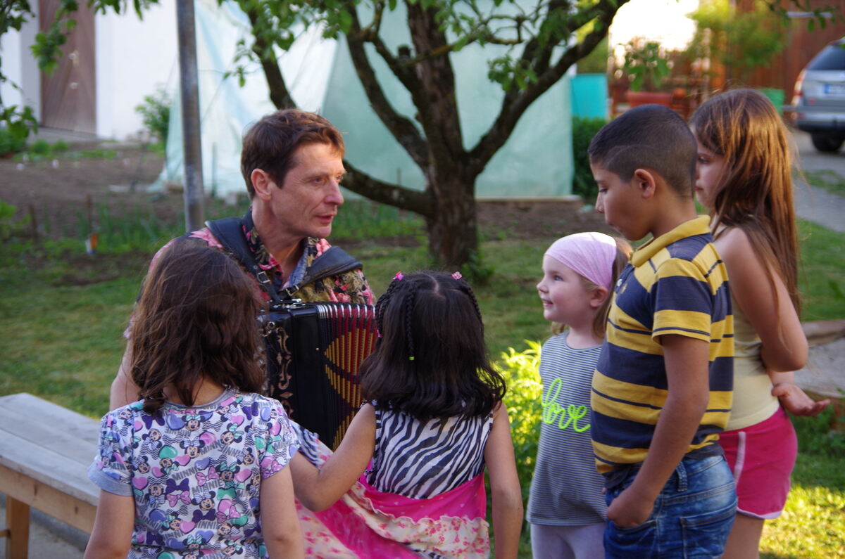 Wolfram Karrer spielte Akkordeon beim Helferfest des Projekts »Flüchtlinge am Werk« in Immenhausen, und die Kinder hörten gebannt zu. FOTO: JOCHEN