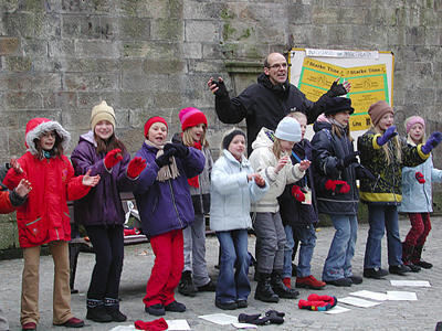 Elternbeirat Harald Gaiser hatte mit Grundschülern eine Gesangseinlage einstudiert. Vor der Tübinger Stiftskirche trugen die Kinder das Ergebnis vor.