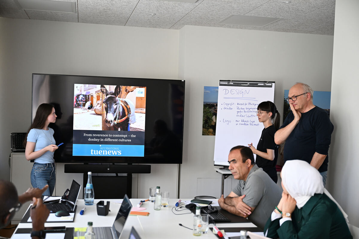 In den Redaktionskonferenzen bespricht das internationale Team die nächsten Aufgaben. Fertige Artikel werden in fünf Sprachen veröffentlicht.