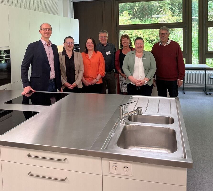 Die Verantwortlichen der Mathilde-Weber-Schule und Werner Walz (Finanzdezernent des Landkreises Tübingen, ganz rechts) stehen in der neuen Küche.