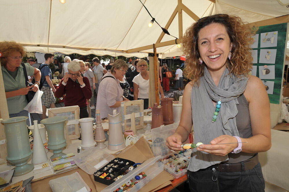 Monica Grelli präsentiert an ihrem Stand Tonvasen und Broschen.