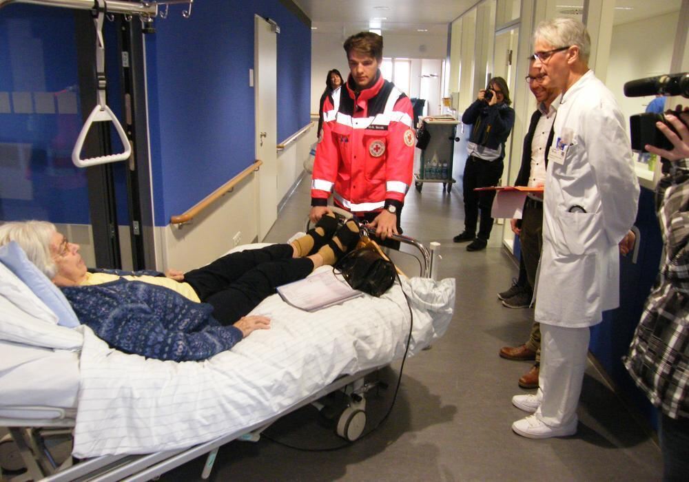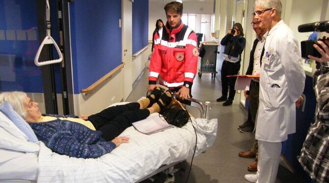 Umzug im Liegen: Die Patienten werden auf die Stationen gebracht. Rechts Chefarzt Johannes-Martin Hahn. FOTO: MAIER