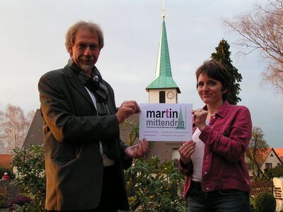 Pfarrer Michael Odenwald und Mechtild Kessler mit dem Martin-Schild vor der Martinskirche in Kirchentellinsfurt.