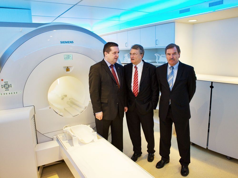 Wenn drei in die Röhre schauen (von links): Ministerpräsident Stefan Mappus mit den Professoren der Uniklinik Claus Claussen und Klinikchef Michael Bamberg mit dem neuen Ganzkörperscanner, der zunächst nur zur Forschung eingesetzt wird.
