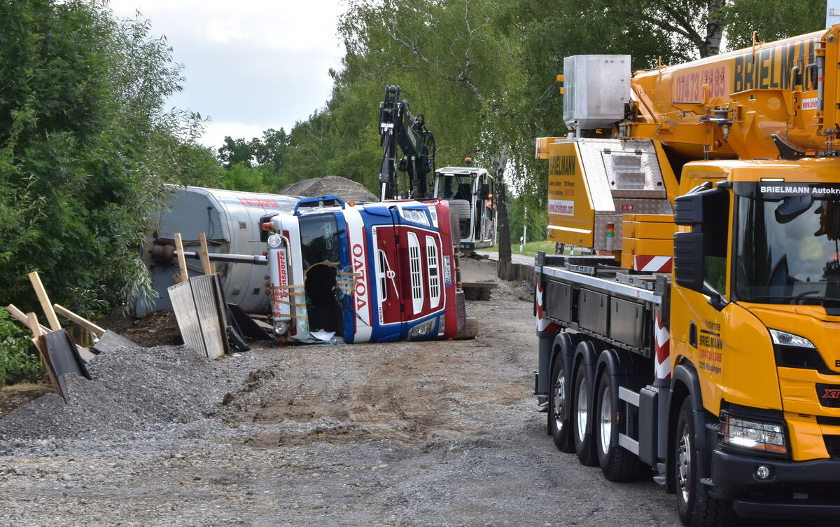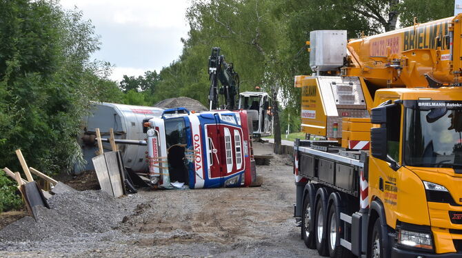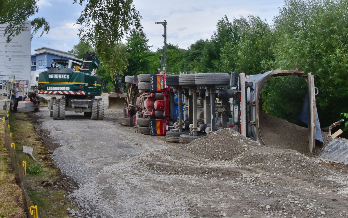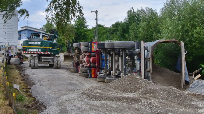 Der Fünfachser war rückwärts von der Mössinger Straße in die Baustelle eingefahren. Auf der Südseite der Bahnlinie wird seit Wochen für den Einschub einer neuen Bahnbrücke eine Arbeitsfläche vorbereitet. Dazu wird die zum Damm hin abfallende Wiesenfläche aufgeschüttet. Beim Versuch, seine tonnenschwere Ladung durch hydraulische Anhebung der Mulde abzuladen, geriet der Einseitenkipper einerseits auf dem aufgeschütteten Boden in leichte Schräglage. Anderseits führte die Gewichtsverlagerung dazu, dass der Kippwinkel überschritten wurde. Zur Bergung durch die Firma Brielmann musste die Straße zwischen Belsen und Mössingen voll gesperrt werden. Die Verkehrspolizei Tübingen hat die Ermittlungen aufgenommen. (GEA)