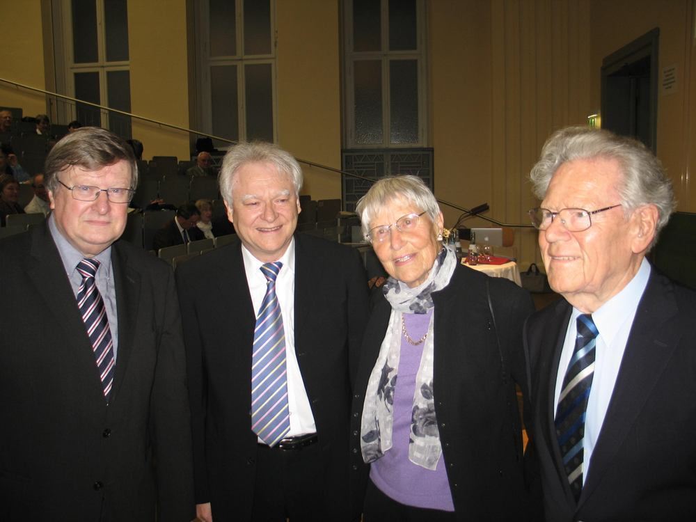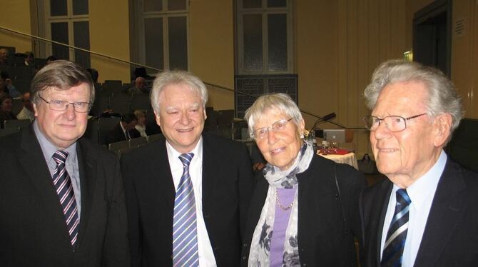 Bei der Feier im Audimax: (von links) Die Redner Karl Josef Kuschel und Joachim Knape mit Inge Jens und Hans Küng. GEA-FOTO: -JK