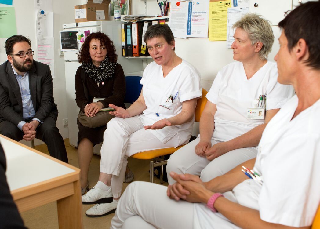 Personalcheck live für Politiker (von links): Chris Kühn (Grüne), Personalrätin Georgia Papadopoulou und Pflegerin Miriam Falso.