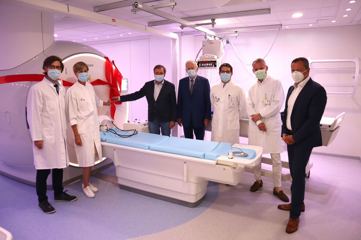 Bei der feierlichen Inbetriebnahme (von links): Daniel Zips, Susanne Schäfer (MTRA Radiologie), Michael Bamberg, Gerhard Sennewald (Dr. Sennewald Medizintechnik GmbH), Konstantin Nikolaou, Jürgen Schäfer und Thomas Richter (Philips GmbH). FOTO: UKT/FISCHER
