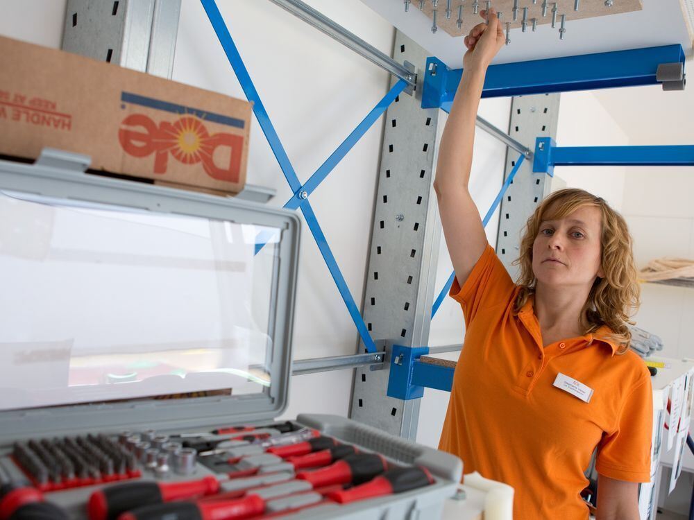Schrauben für die Rückkehr in den Beruf: Ergotherapeutin Stephanie Veser demonstriert in einem Behandlungsraum, wie sie mit Patienten aus dem Handwerk das Arbeiten über Kopf trainiert.