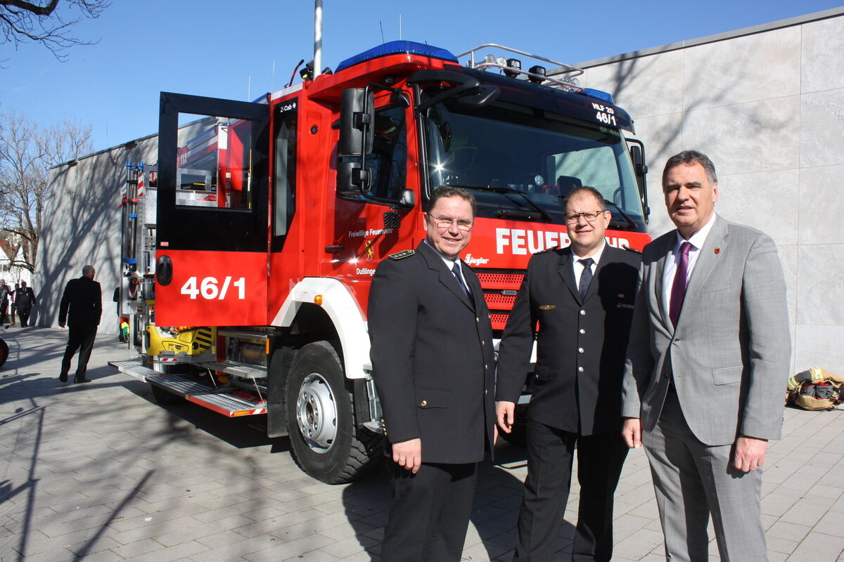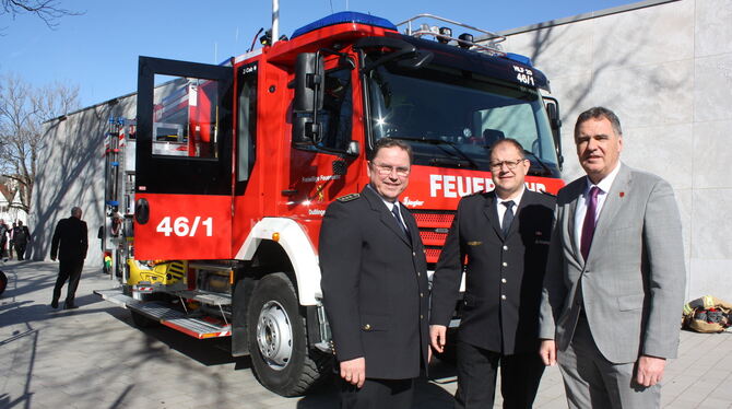 Das Fahrzeug hinter Kreisbrandmeister Marco Buess, Sven Laichinger (Kommandant der Dußlinger Feuerwehr) und Dußlingens Bürgermeister Thomas Hölsch ersetzte das noch recht neue Fahrzeug, das im Juni 2021 während des Starkregen-Einsatzes im Dußlinger Tunnel verschrottet werden musste. FOTO: STURM