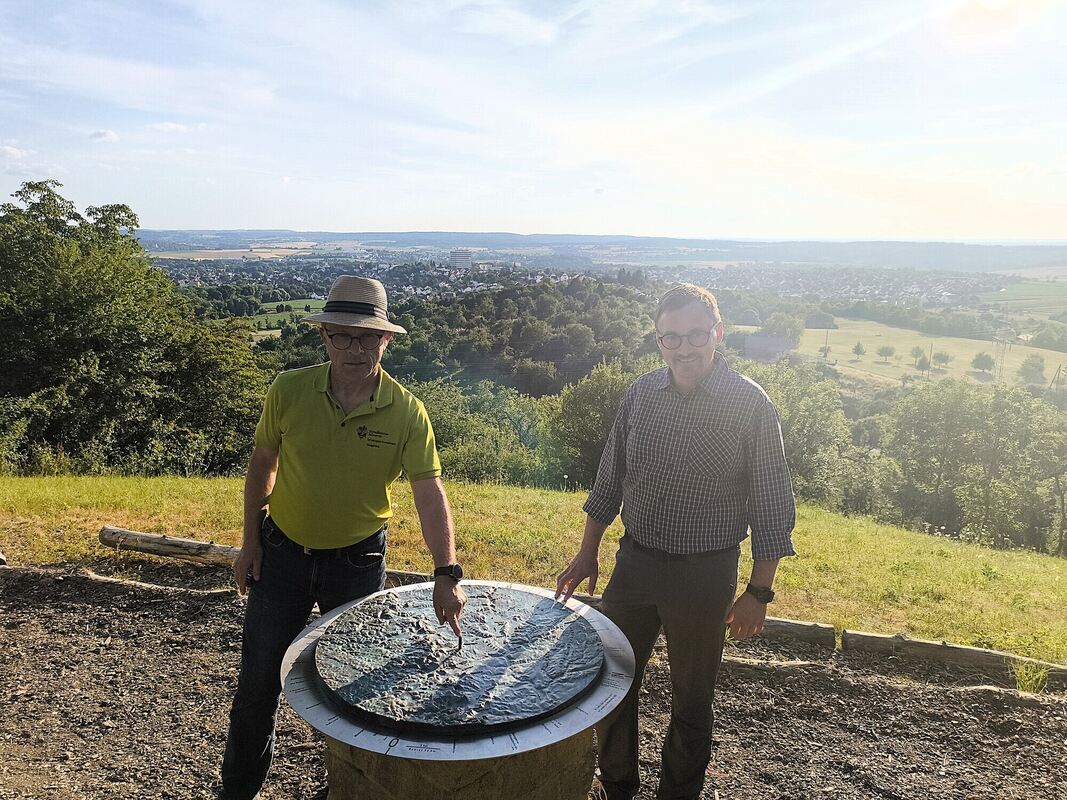 SAV-Vorstand Stephan Rilling (links) zeigt das Gomaringer Horn in der Mitte und freut sich mit Bürgermeister Steffen Heß über die neue Peilscheibe