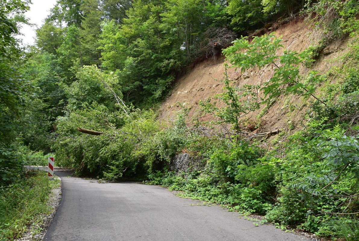 Laut Stadtverwaltung »sind die Geologen an der Untersuchung dran«. Man warte wohl ab, bis die Wiesen auf der Hochfläche oberhalb der Rutschung entwässert haben. Beim momentan vorherrschenden »Sommerwetter« sei jedoch nicht abzusehen, wann der Bauhof und die Forstverwaltung die Straße räumen. (mey)