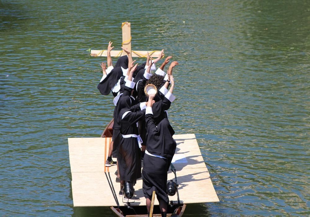 Hier eine Mannschaft beim Stocherkahnrennen 2015, die besonders gläubig übers Wasser glitt. Rückzug und innere Einkehr sind aber auch für nicht ganz echte Nonnen bei dem Rennen ein Problem, die Schau bei der Kostümparade dafür groß. ARCHIVBILD: GOLZ