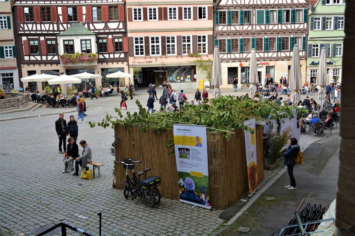 TÜBINGEN. »Durch das Pflanzendach kann man die Sterne sehen«, erläuterte Michaela Buckner die Konstruktion der Laubhütten, die gestern auf dem Tübinger Marktplatz aufgebaut waren. »Einmal im Jahr ist man so Wind und Wetter ausgesetzt und damit abhängig von Gott.« Die Hütten waren Teil des Informationstags, den die Organisatoren mit dem traditionellen jüdischen Laubhüttenfest Sukkot verbanden. Mit diesem Fest erinnern die Juden an den Auszug aus Ägypten. Weitere Programmpunkte des Tages: die von Buckner kuratierte Ausstellung »Entdecken – Aufdecken – das Schweigen durchbrechen« sowie ein Solidaritätsmarsch durch die Innenstadt. (GEA)