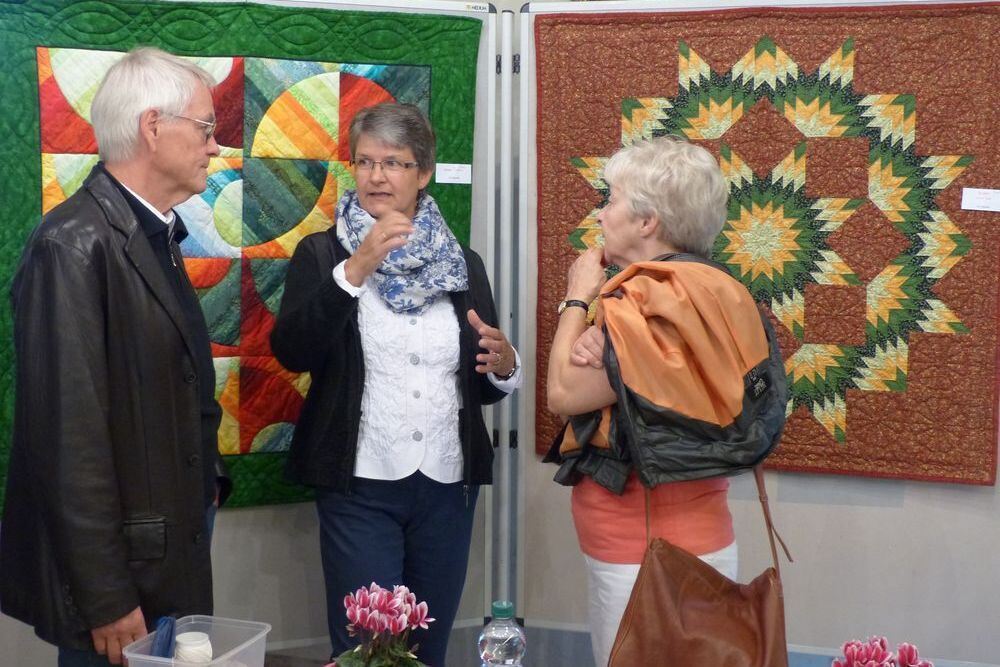 Die Quilt-Künstlerin Iris Jakubik (Mitte) beantwortete gerne die Fragen der Ausstellungsbesucher. FOTO: WEBER