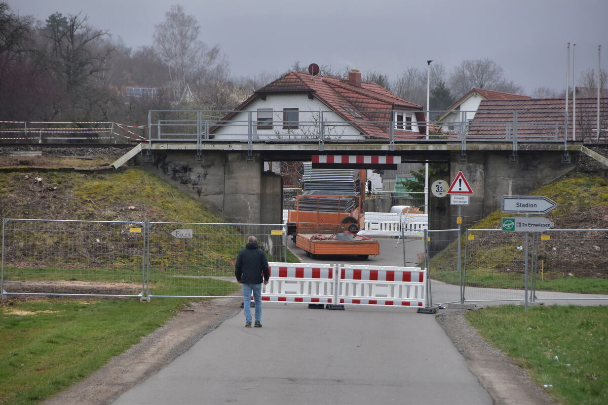 MÖSSINGEN. Ziemlich überrascht standen am Montag viele Verkehrsteilnehmer in Belsen und Mössingen vor Straßenabsperrungen. Die mithin am meisten befahrene innerörtliche Verbindungsstraße – das Ernwiesensträßchen – wurde am Morgen für den Verkehr dicht gemacht. Zwischen dem Ortsteil Belsen und dem Gewerbegebiet ist ab sofort kein Durchkommen mehr. Ebenso wenig kann man in Gegenrichtung vom Kreisverkehr in der Butzenbadstraße (beim OBI) hoch zum Sportheim am Ernwiesenstadion fahren. Grund sind die Arbeiten an der Eisenbahnbrücke. Die rund hundert Jahre alte Überquerung muss – wie berichtet – erneuert und den Bedürfnissen der Regional-Stadtbahn angepasst werden. Nun ist Geduld gefragt, denn die Bauarbeiten sind bis Jahresende terminiert. Die nächsten zehn Monate heißt es Umwege fahren und laufen. Die Brücke und der angrenzende Bahndamm sind weiträumig eingezäunt. Die Zufahrt zu den Glas- und Altkleidercontainer erfolgt nun ausschließlich über die Albblick- und Öhrnbachstraße. Fußgänger und schiebende Radfahrer können sich zwischen dem Sportheim und dem Ernwiesensträßle entlang des Absperrgitters bewegen. Allerdings auf unbefestigtem Untergrund. Die neue Eisenbahnbrücke wird auf 3,30 Meter Höhe und von 4,50 auf 5,50 Meter Breite mit einem Gehweg vergrößert. (mey)