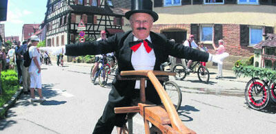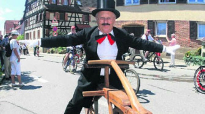 Eleganter »Flieger« auf dem Laufrad: Erich Walker machte beim Kirchentellinsfurter Festumzug mit 56 Gruppen eine gute Figur und sorgte für Stimmung.