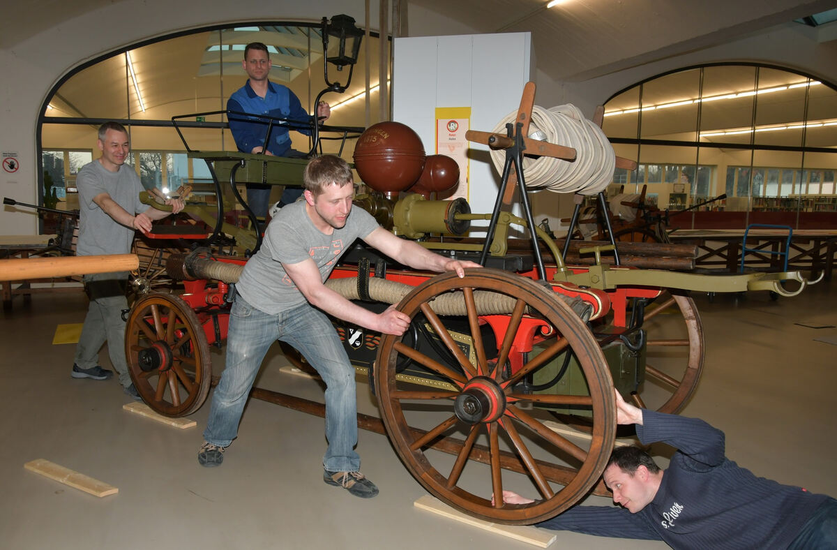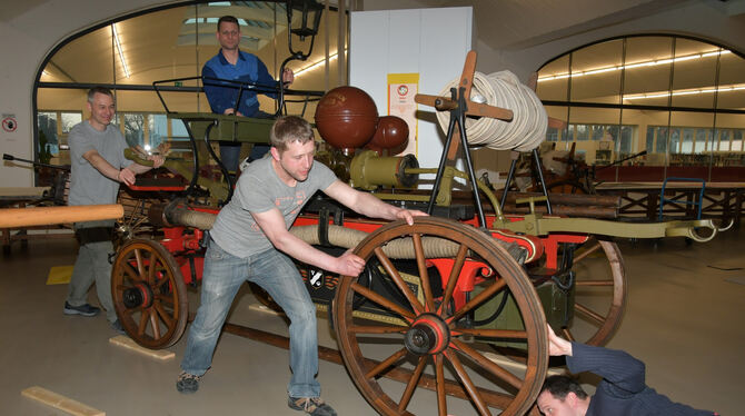 Passt, wackelt und hat Luft: Jochen Rein, Jonas Häring, Sascha Walz und Patrick Flammer in Mössingen beim Aufbau.