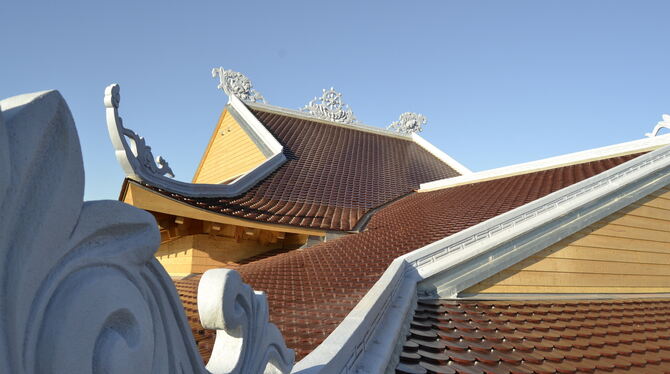 TÜBINGEN-BÜHL/REUTLINGEN. An der schnöden Eingangstür aus den späten 1960er-Jahren hängt ein schlichter Zettel in Plastikfolie verpackt: Vien Quang Pagode steht da ganz bescheiden. Weniger zurückhaltend ist die Dachgestaltung ausgefallen. Das Dach der Pagode mit den typisch geschwungenen Formen ist überall mit asiatischen Ornamenten und im Zentrum mit einem großen Rad geschmückt: »Die sind aus Beton geformt und tonnenschwer«, weiß der Tübinger Architekt Armin Junger.