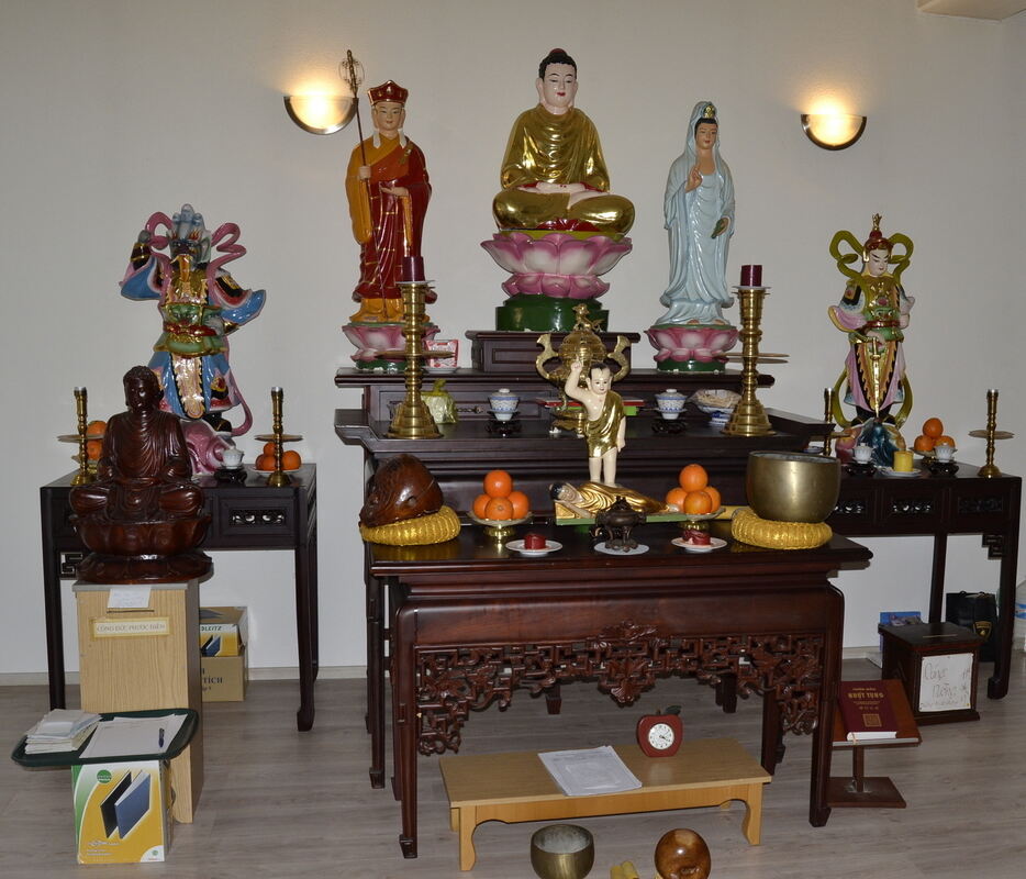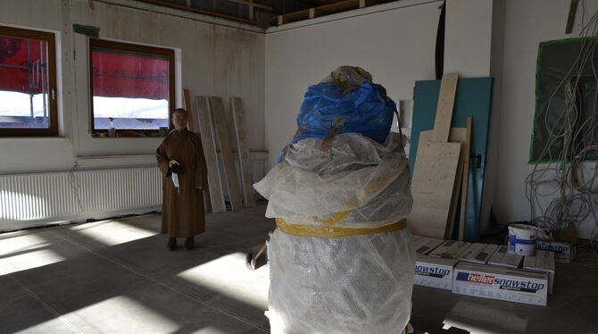 Bevor die fertig war, schwebte eine fast vier Meter hohe Buddha-Statue an Seilen befestigt in den Raum, der einmal der große Gebets- und Andachtssaal werden soll. Noch ist die imposante Statue aus Glasfaser und Kunststoff in Plastikfolie und eine große Kiste eingepackt. Doch wenn der geistliche Betrieb im buddhistischen Zentrum einmal startet, wird sie im Mittelpunkt des großen Raumes mit dem offenen Giebel aus Holz stehen. Auch die mehrere hundert Kilo schwere Glocke ist schon eingetroffen. Sie ist ebenfalls noch eingepackt. Die Hausherrin, Frau Thi Huong Van, weiß schon genau, wo die große Glocke einmal ihren Platz finden wird: »Die kommt dort hin«, sie deutet in die rechte Hälfte des Raumes. Die Glocke wird nicht nach oben an die Decke gehängt, sondern findet Platz in einer Art Tragegestell. So kann sie einfacher geschlagen werden, meint Frau Thi Houng Van, die als erste Nonne und Äbtissin bereits in das künftige Kloster eingezogen ist. Ihr geistlicher Name ist Thich Hanh Trang.