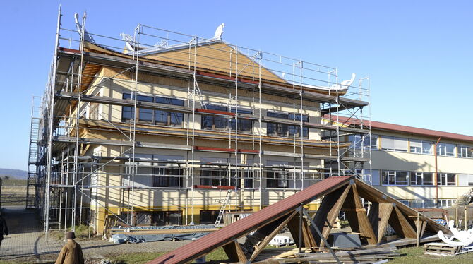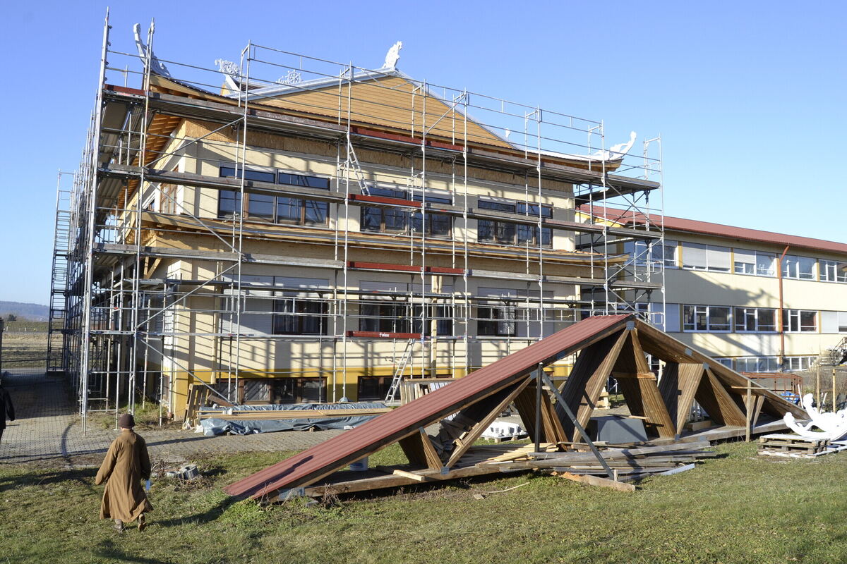 Bauherrin ist die vietnamesisch-buddhistische Gemeinde Reutlingen-Tübingen. Sie hatte das Gebäude, das einmal Teil der früheren Berufsschule in Bühl war, vor einiger Zeit gekauft und den Tübinger Architekten Armin Junger mit dem Umbau beauftragt. »Eine große Herausforderung war das imposante Dach mit seinen typisch geschwungenen Formen und den großen asiatischen Ornamenten«, erklärt Architekt Junger. Das alte Dach wurde abgetragen und die Zimmerleute errichteten eine mehrstufige Holzkonstruktion.