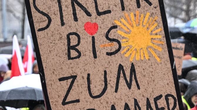 Teilnehmer zeigen ein Schild mit der Aufschrift »Streik bis zum Sommer« bei der Demonstration der Gewerkschaften für Beschäftigte,.