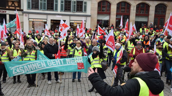 TÜBINGEN. Eine »Schicksalstarifrunde« ist es für Gewerkschaftssekretär Jonas Weber. Viele Mitglieder hätten signalisiert: »Wenn Verdi jetzt einknickt, dann gehen wir raus.« Nachdem die zweite Verhandlungsrunde im Öffentlichen Dienst mit einem für die Dienstleistungsgewerkschaft unakzeptablen Ergebnis endete, wurden die Warnstreiks ausgeweitet. Gestern kam eine bunte Mischung von Angestellten des Öffentlichen Dienstes auf dem Tübinger Marktplatz zur Kundgebung zusammen. Von Mitarbeitern der Stadt, des Landratsamts und Jobcenters, über Kreissparkassen-Angestellten bis zu Erzieherinnen, Stadtwerke-Angestellten und KBF-Mitarbeitern.