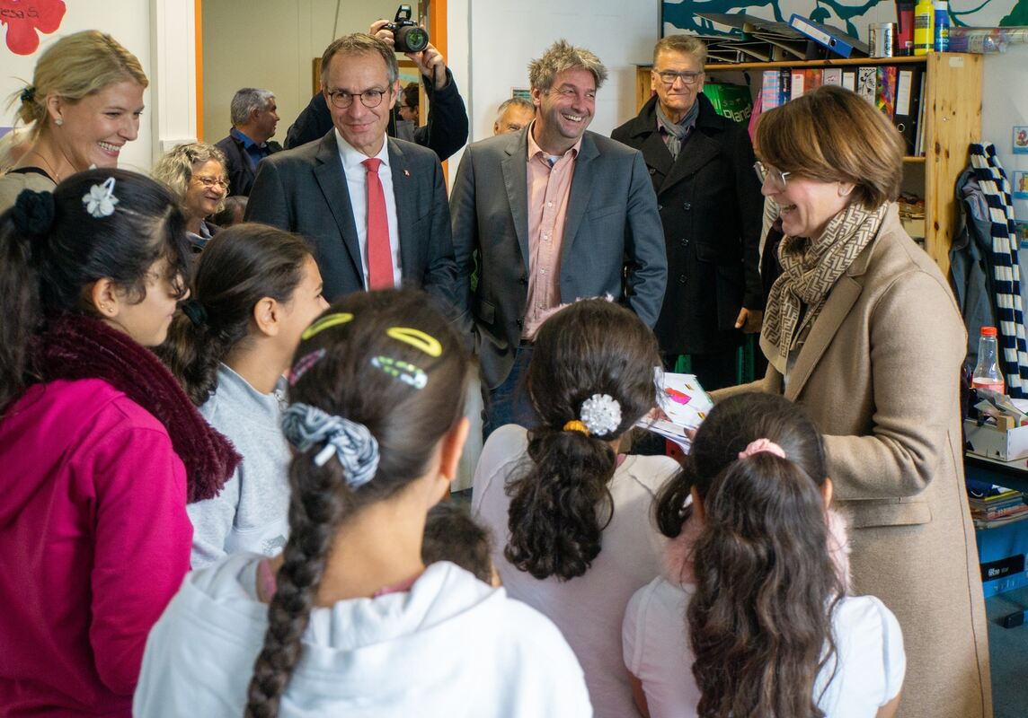 Eine Gruppe der Vorbereitungsklasse, einer Klasse für Kinder mit Flüchtlingshintergrund, hatte für den hohen Besuch ein Gedicht geschrieben. Jedes Kind überreichte Widmann-Mauz ein selbstgestaltetes Exemplar.