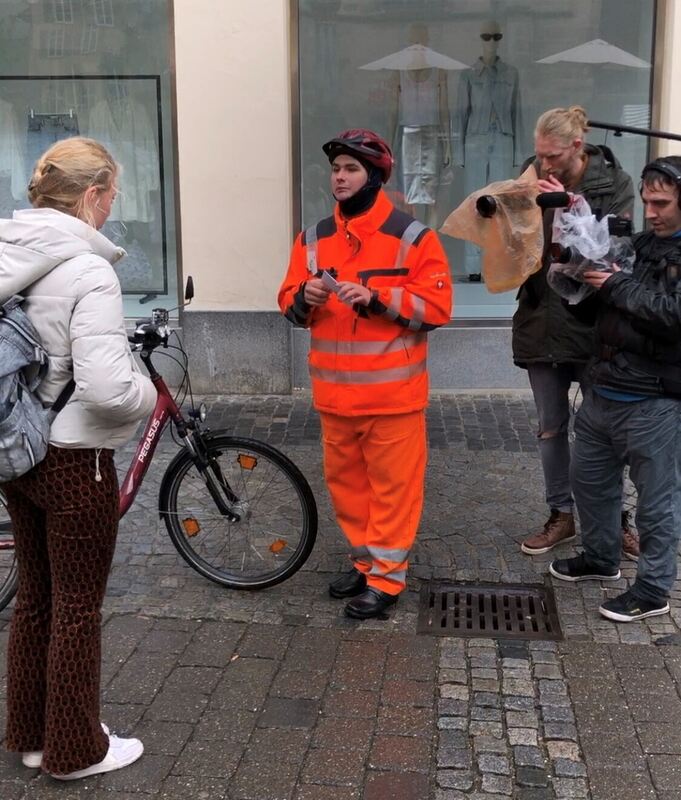 Ein Kamera-Team begleitete den »Anzeigenhauptmeister« am Vormittag durch die Innenstadt. »Wir drehen hier einen Werbefilm«, erklärte Marvin Pagel. Er ist Gründer und Geschäftsführer der Tübinger Werbeagentur Flügelmann. Ihr Kunde für diesen Dreh: das Modehaus Zinser. Im Namen des Tübinger Unternehmens ahndete der Hobby-Sheriff »Knöllchen« für Modesünden. So etwa für Schlaghosen, die »seit den 80ern nicht mehr erlaubt« sind oder für »kriminelle« Jogging-Outfits. Anstatt echte Anzeigen zu erstatten, stellte er den »Beschuldigten«, allesamt Mitarbeiter der Tübinger Werbeagentur, jedoch Zinser-Gutscheine aus - alles für den Werbefilm.