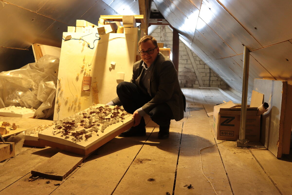 Ein Umzug ist als Erstes immer auch eine Zeitreise in die Vergangenheit. Gomaringens Bürgermeister Steffen Heß hat auf dem Rathaus-Dachboden jede Menge alte Modelle gefunden. FOTO: WALDERICH